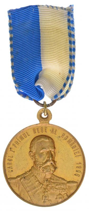 Romania 1906. "60th Anniversary of the Coronation of Carol I" gilt Br medal with modern ribbon (37mm) C:XF small edge error