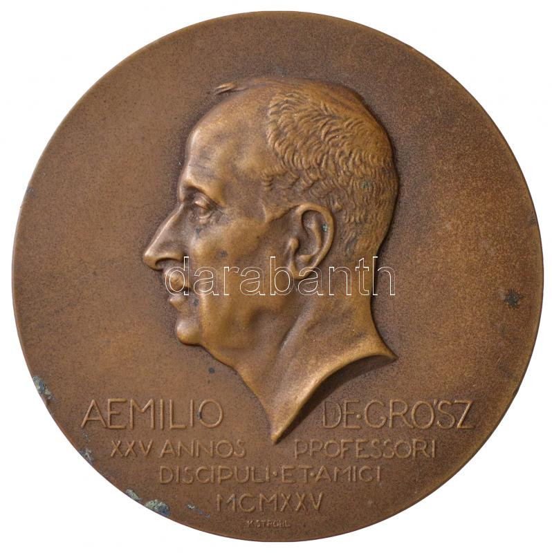 Kisfaludi Stróbl Zsigmond (1884-1975) 1925. "Grósz Emil" egyoldalas Br plakett. "AEMILIO DE GRÓSZ XXV ANNOS PROFESSORI DISCIPULI ET AMICI MCMXXV" (136,01g/80mm) T:2 kis ph., szennyeződés / Hungary 1925. "Emil Grósz" one-sided Br plaque. Sign.: Zsigmond Kisfaludy Stróbl (136,01g/80mm) C:XF small edge error, dirt HP 4914.