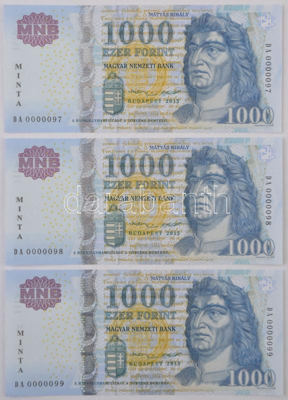 Beschreibung: 2015. 1000Ft fekete "MINTA" felülnyomással (3x) sorszámkövetők, "DA 0000097, 0000098, 0000099" sorszámokkal T:I /