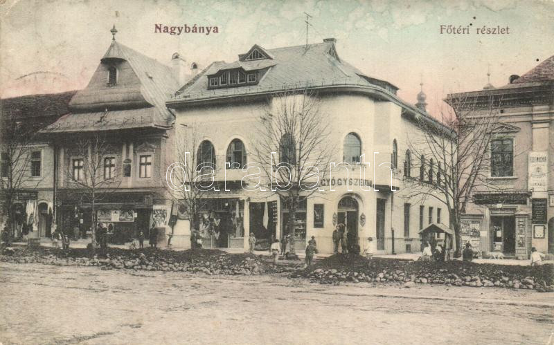 Beschreibung: Nagybánya, Baia Mare; főtér, gyógyszertár; Frankovits Aladár üzlete és saját kiadása / main square, shops