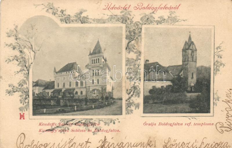Beschreibung: Őraljaboldogfalva, Boldogfalva, Santamaria-Orle; Kendeffy-kastély református templom / castle, church, floral (fa)