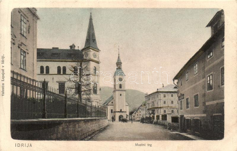 Beschreibung: Idrija, Idria; Mestni trg, Valentin Lapajne v Idriji / market place, shops