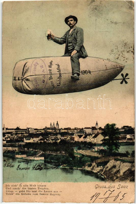 Zatec, Saaz; Saazer Bezik Hopfen, flying gentleman collage (EK) https://www.darabanth.com/de/25-Gross-Auktion/25.1/Postkarten-Topographie-Weltweit/Tschechische-Republik~9829/Zatec-Saaz-Saazer-Bezik-Hopfen-flying-gentleman-collage-EK~II1377930