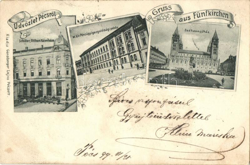 1899 Pécs, Schiller Otthon kávéháza, pénzügyigazgatóság, székesegyház;... https://www.darabanth.com/de/25-Gross-Auktion/25.1/Postkarten-Topographie-Weltweit/Ungarn~9810/1899-Pecs-Schiller-Otthon-kavehaza-penzugyigazgatosag-szekesegyhaz-floral-kiadja-Gun~II1195319