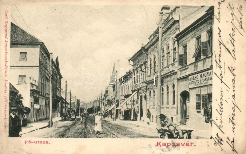 Beschreibung: Kaposvár, Fő utca, Első Magyar Biztosítótársaság főügynöksége; Gerő Zsigmond könyvkereskedő kiadása