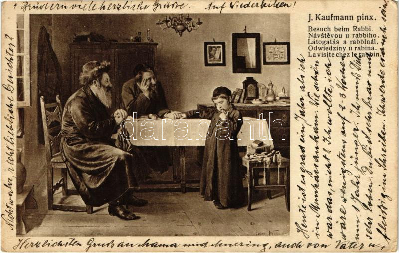 Látogatás a rabbinál / Besuch beim Rabbi, Judaica s: J. Kaufmann (EK) https://www.darabanth.com/de/25-Gross-Auktion/25.1/Thematik-und-Kunstlerkarten/Judaica~9885/Latogatas-a-rabbinal-Besuch-beim-Rabbi-Judaica-s-J-Kaufmann-EK~II1074105