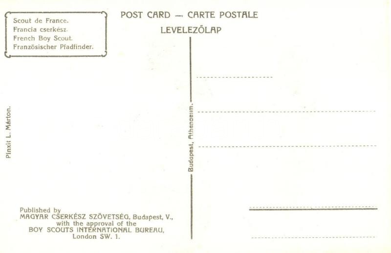 Francia cserkész; kiadja a Magyar Cserkész Szövetség / French boy scou... https://www.darabanth.com/de/25-Gross-Auktion/25.1/Thematik-und-Kunstlerkarten/Pfadfinder~9882/Francia-cserkesz-kiadja-a-Magyar-Cserkesz-Szovetseg-French-boy-scout-s-Marton-L~II1375370