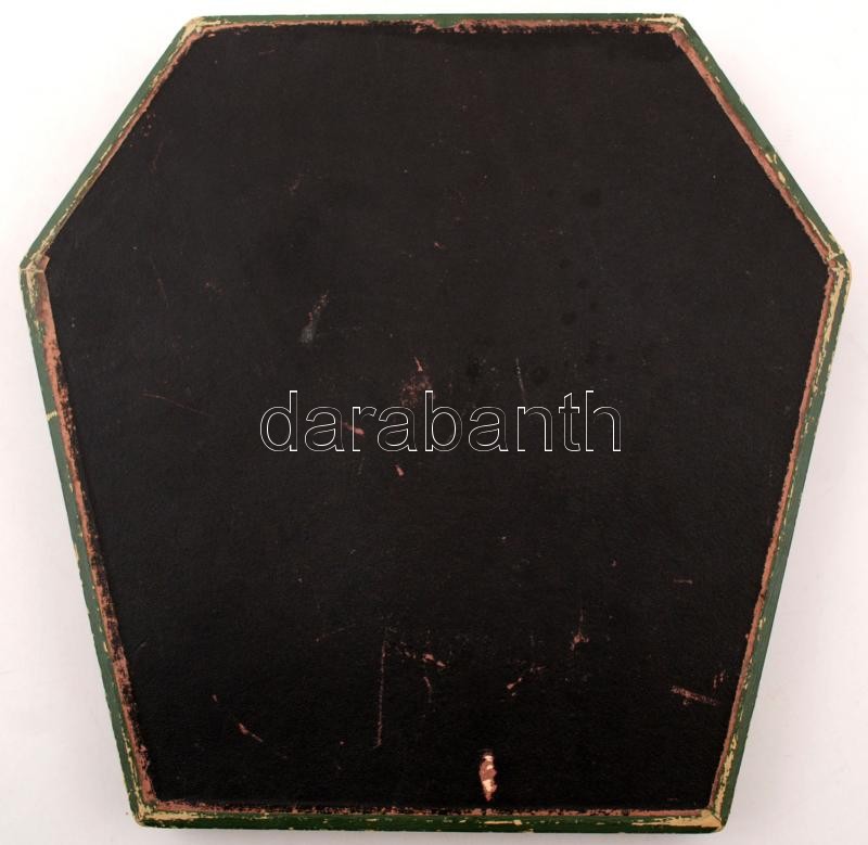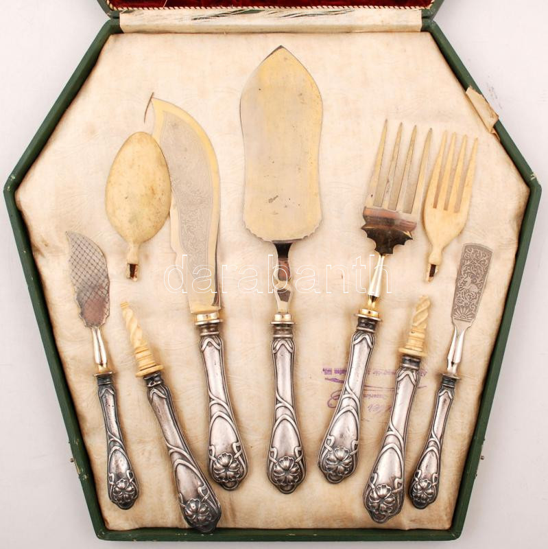 Ezüst (Ag.) nyeles, gazdagon díszített kínáló készlet (tortalapátok, villák, kanál), Geller I., Arad, az egyik villa és kanál csont fejjel (sérültek), jelzettek, összesen 7 db, saját dobozában