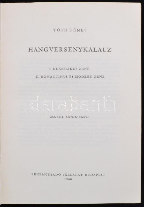 Tóth Dénes: Hangversenykalauz I-II. I. Klasszikus zene, II. romantikus... https://www.darabanth.com/de/250-Fernauktion/250.0/Andere-Sammelgebiete/Bucher-Architektur-Kunst~1400016/Toth-Denes-Hangversenykalauz-I-II-I-Klasszikus-zene-II-romantikus-es-modern-zene-Masodik-~II1206729