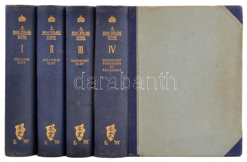 A mai világ képe. I-IV. köt. (4 db) Teljes! Bp. (1935) KMENY. 607p. 536p. 526p., 576p. I. Szellemi élet. Szerk.: Kornis Gyula. Világnézet, kultúra, erkölcs, tudomány, művészet stb. II. Politikai élet. Szerk.: Gratz Gusztáv. A jelenkor politikája. Politikai rendszerek stb. III. Gazdasági élet. Szerk.: Hegedűs Lóránt. A világháború hatása, közlekedés, világgazdaság stb. IV. Természettudomány és technika. Szerk.: Csűrös Zoltán. Építészet, gyógyítás stb. Kiadói, egységes, aranyozott gerincű félbőr-kötésben. Gazdag kép-, térkép-, és ábraanyaggal. Félbőr kötésben