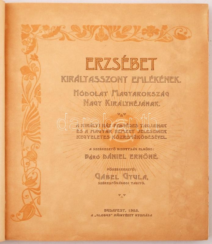 Erzsébet királyasszony emlékének. Hódolat Magyarország nagy királynéjának. Főszerk.: Gábel Gyula. Bp., 1905, Globus Műintézet. Kicsit kopott, díszes, dombornyomott, festett vászonkötésben, jó állapotban.