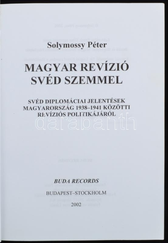 Solymossi Péter: Magyar revízió svéd szemmel. Svéd diplomáciai jelentések Magyarország 1938-1941 közötti revíziós politikájáról. Budapest-Stockholm, 2002, Buda Records. Illusztrált kiadói papír kötésben, szép állapotban