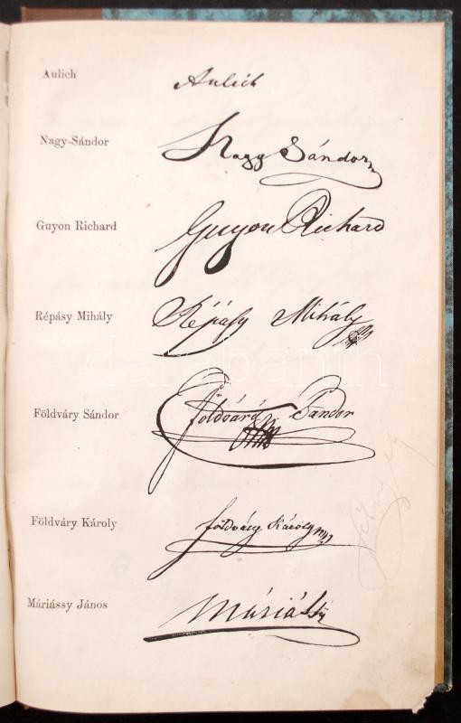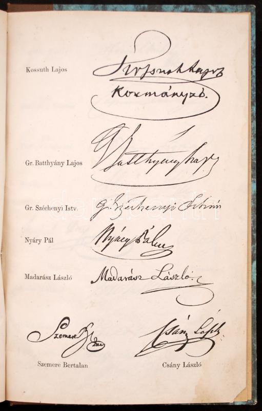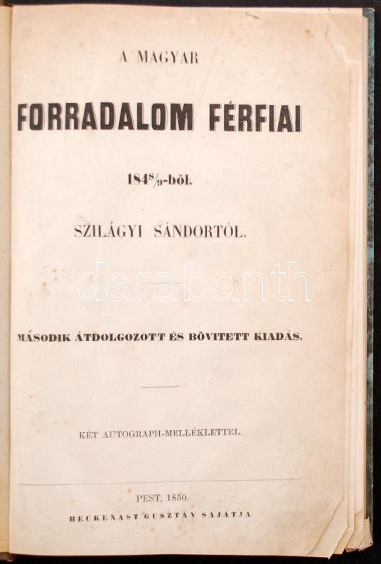 Szilágyi Sándor: A magyar forradalom férfiai 1848/9-ből. Második átdolgozott és bővített kiadás. Két autograph-melléklettel. Pest, 1850. Heckenast. (8)+344+(8)p.+1 kihajt. mell. Későbbi félvászon-kötésben. Az egyik kihajtható melléklet fele hiányzik.