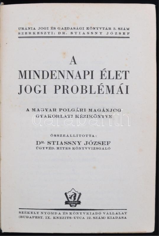 Beschreibung: dr. Stiassny József: A mindennapi élet jogi problémái. Bp., é.n. Székely nyomda. Aranyozott egészvászon kötésben