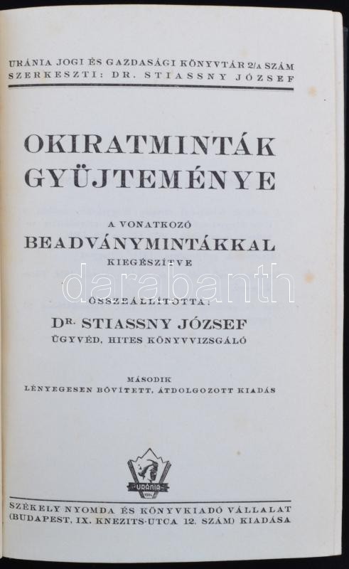 dr. Stiassny József: Okiratminták gyűjteménye. Bp., é.n. Székely nyom... https://www.darabanth.com/de/250-Fernauktion/250.0/Andere-Sammelgebiete/Bucher-Justiz~1400007/dr-Stiassny-Jozsef-Okiratmintak-gyujtemenye-Bp--en-Szekely-nyomda-Aranyozott-egeszva~II1201838