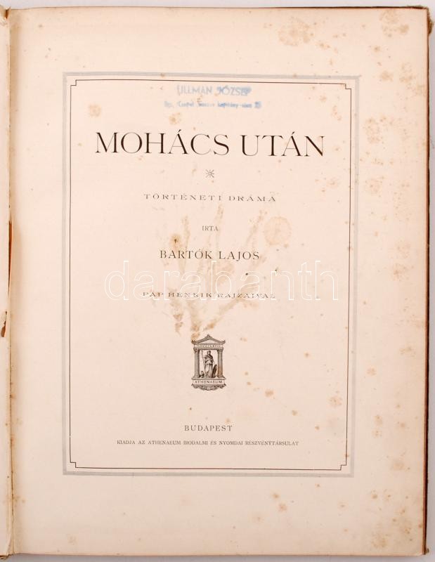 Bartók Lajos: Mohács után. Történeti dráma. Bp., [1898], Athenaeum. Számos illusztrációval, aranyozott lapszélekkel, kissé foltos lapokkal. Kopott, díszes, festett vászonkötésben.