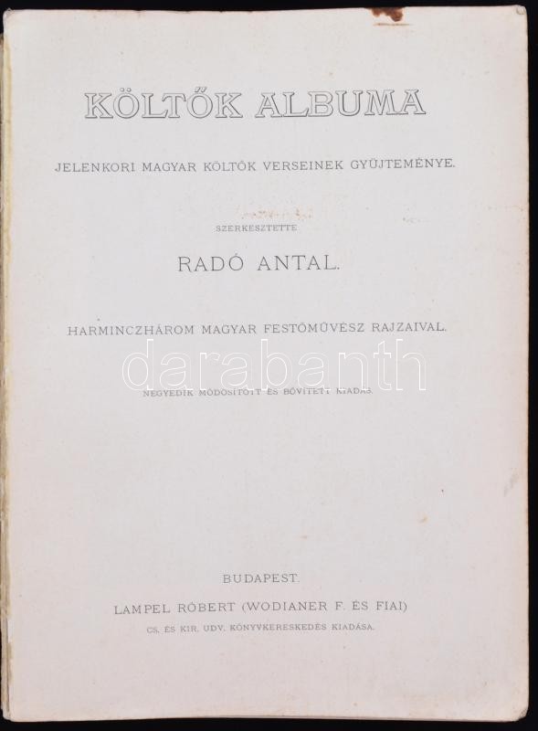 Költők Albuma. Szerkesztette: Radó Antal. Bp., (1890) Lampel Róbert (Wodianer F és fiai). Kiadói karton kötésben, a borító elvált, de a belső oldalak nagyon szép állapotban. Sok szép illusztrációval. 220p.