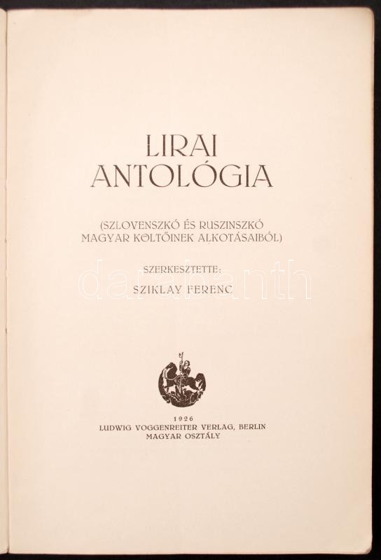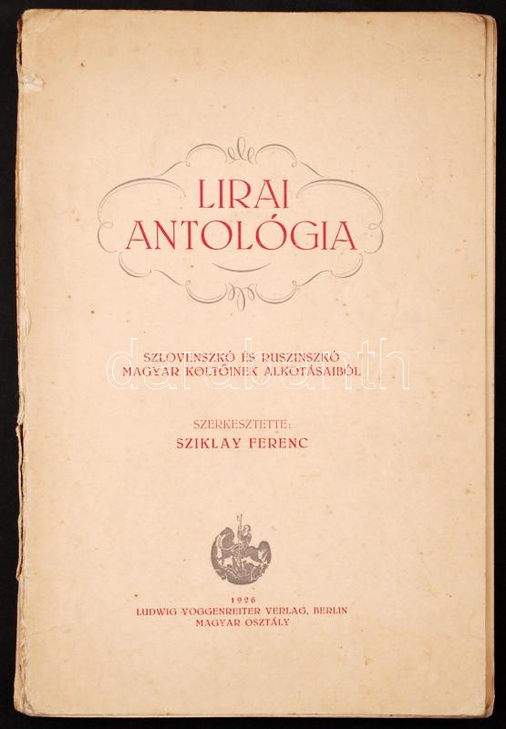 Lírai Antológia (Szlovenszkó és Ruszinszkó magyar költőinek alkotásaiból) Szerk. Sziklay Ferenc. Berlin, 1926. Ludwig Voggenreiter 171 p. Kiadó karton kötésben, gerinc sérülz
