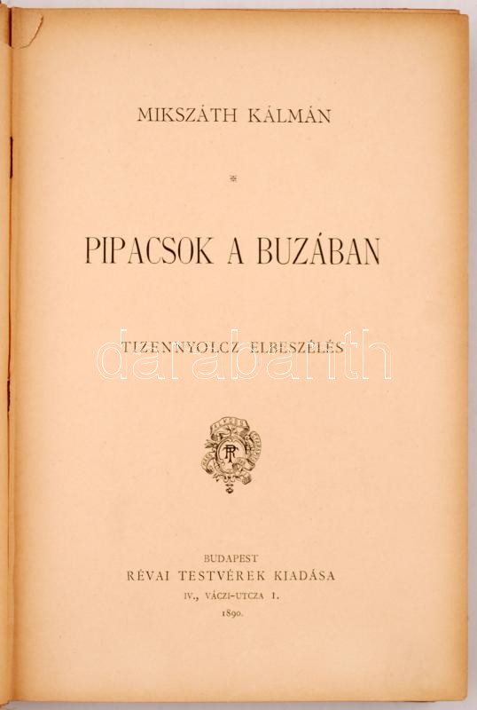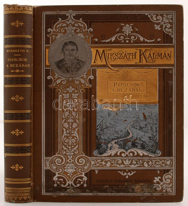 Mikszáth Kálmán: Pipacsok a búzában. Első kiadás! Bp., 1890. Révai Testvérek kiadása Kiadói, díszes, festett, dúsan aranyozott, a szerző arcképével is illusztrált, sötétbarna egészvászon kötésben, festett lapszélekkel. A kötés Gottermayer Nándor műhelyében készült, Aufrecht és Goldschmied kliséivel. A fűzés szétvált., borítón szennyeződés.