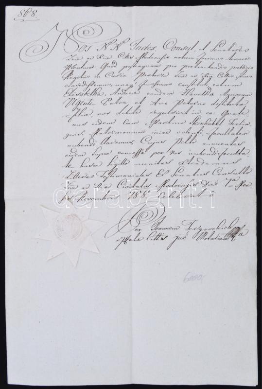 Beschreibung: 1788 Modor (Pozsony vm.), a városi tanács latin nyelvű okmánya házasság engedélyezéséről, rányomott felzetes viaszpecséttel