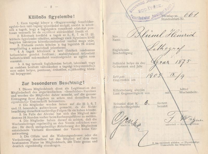 1905 A Magyarországi "Senefelder" Egylet igazolványa és alapszabálya, ... https://www.darabanth.com/de/250-Fernauktion/250.0/Andere-Sammelgebiete/Dokument~1400033/1905-A-Magyarorszagi-Senefelder-Egylet-igazolvanya-es-alapszabalya-magyar-ill-nemet-nyelve~II1203191