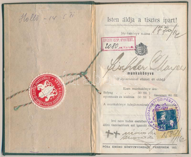 1916 Budapest Székesfővárosi Czipészipartestület Munkakönyv,1 oldal hi... https://www.darabanth.com/de/250-Fernauktion/250.0/Andere-Sammelgebiete/Dokument~1400033/1916-Budapest-Szekesfovarosi-Czipeszipartestulet-Munkakonyv-1-oldal-hianyzik-pp48-17x10cm~II1203953