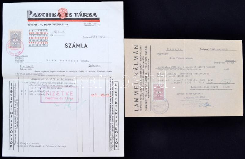 Beschreibung: 1940-1941 Bp., Paschka és Társa Kályhák stb. és Lammel Kálmán fűtés, vízvezeték stb. vállalatának díszes fejléces számlája, 2 db