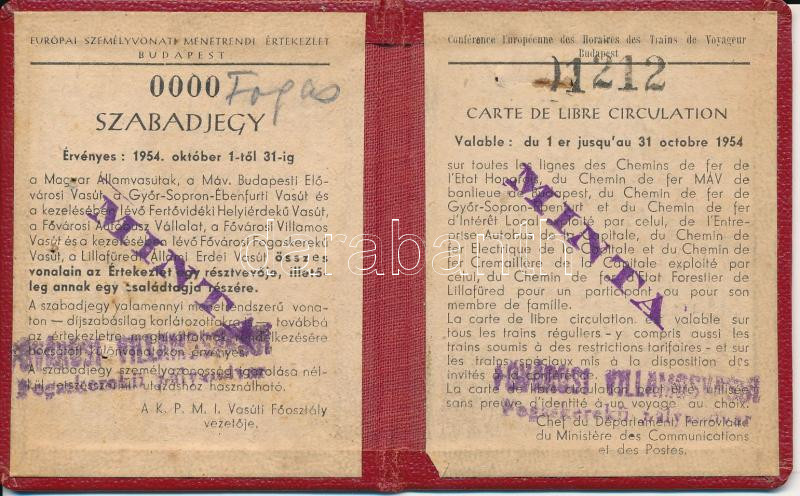 1954 Európai Személyvonat Menetrendi Értekezlet Szabadjegy, 8x6cm https://www.darabanth.com/de/250-Fernauktion/250.0/Andere-Sammelgebiete/Dokument~1400033/1954-Europai-Szemelyvonat-Menetrendi-Ertekezlet-Szabadjegy-8x6cm~II1203148