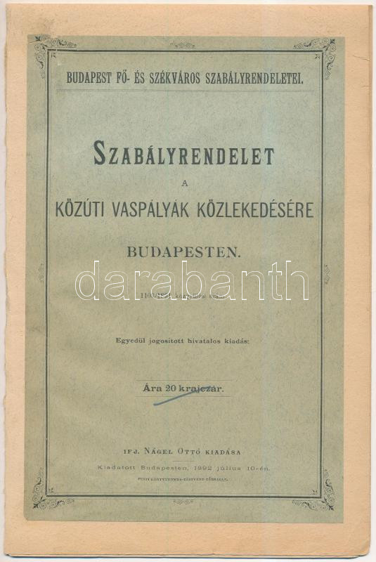 1892 Szabályrendelet a közúti vaspályák közlekedésére Budapesten. Bp.,... https://www.darabanth.com/de/250-Fernauktion/250.0/Andere-Sammelgebiete/Drucksachen~1400004/1892-Szabalyrendelet-a-kozuti-vaspalyak-kozlekedesere-Budapesten-Bp-Nagel-Otto-Javito~II1206455