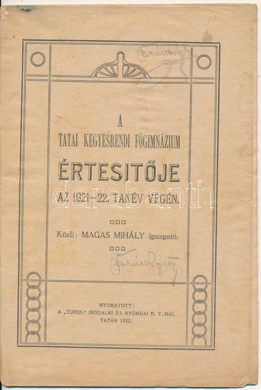 1922 A Tatai Kegyesrendi Főgimnázium értesítője az 1921-22. tanév végé... https://www.darabanth.com/de/250-Fernauktion/250.0/Andere-Sammelgebiete/Drucksachen~1400004/1922-A-Tatai-Kegyesrendi-Fogimnazium-ertesitoje-az-1921-22-tanev-vegen-26p~II1201259