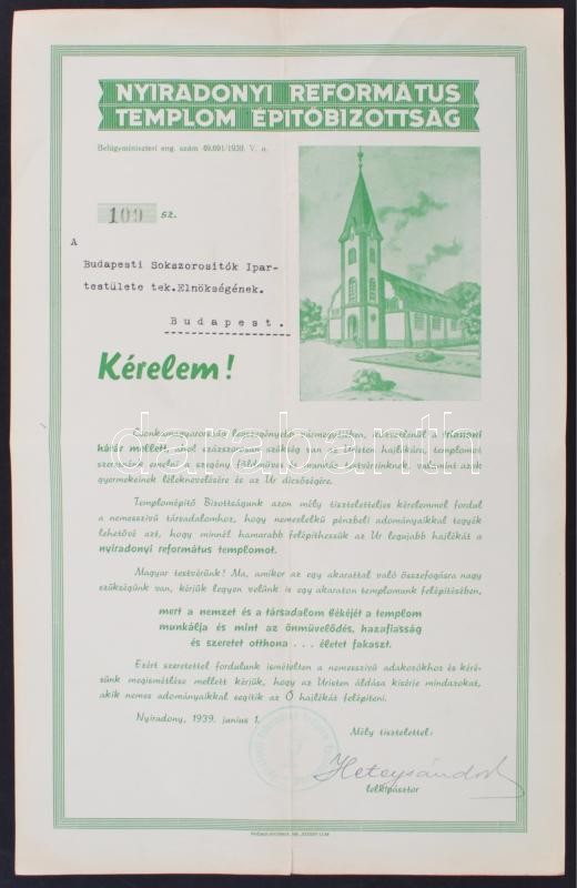 Beschreibung: 1939 Adománygyűjtés a nyiradonyi református templom megépítéséhez, sorszámozott (109) nyomtatvány, 34x21cm