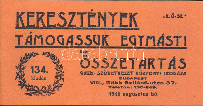 1941 "Keresztények támogassuk egymást!" - az Összetartás Gazd. Szövetk... https://www.darabanth.com/de/250-Fernauktion/250.0/Andere-Sammelgebiete/Drucksachen~1400004/1941-Keresztenyek-tamogassuk-egymast--az-Osszetartas-Gazd-Szovetkezet-Kozponti-Irodaja-~II1203744