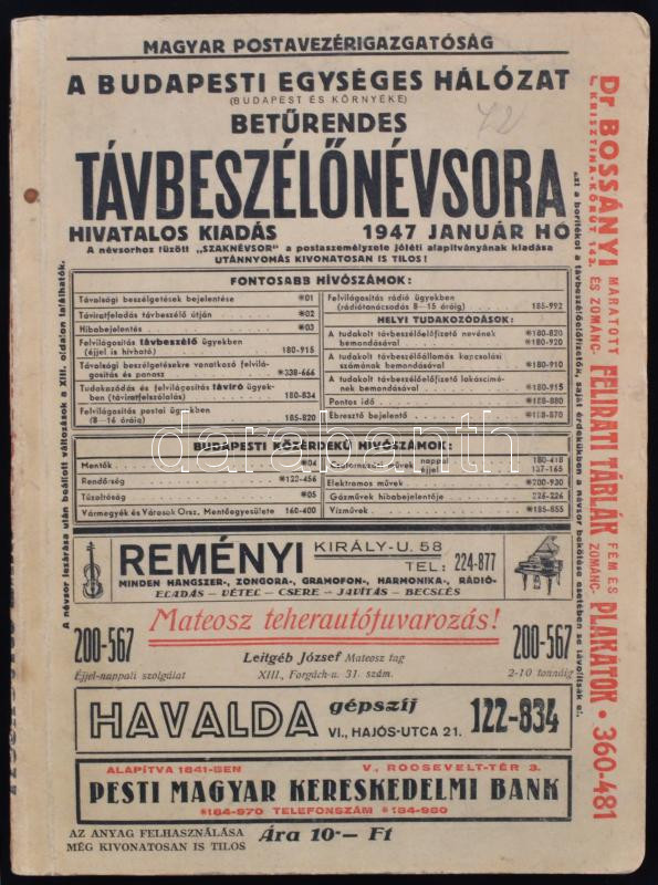 1947 Budapesti távbeszélő hálózat betűrendes névsora. Jó állapotban https://www.darabanth.com/de/250-Fernauktion/250.0/Andere-Sammelgebiete/Drucksachen~1400004/1947-Budapesti-tavbeszelo-halozat-beturendes-nevsora-Jo-allapotban~II1204109
