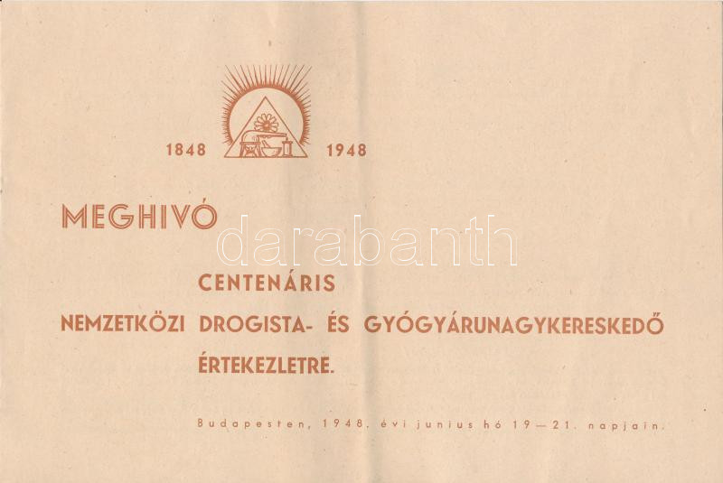 1948 Meghívó Centenáriás Nemzetközi Drogista- és Gyógyárunagykereskedő... https://www.darabanth.com/de/250-Fernauktion/250.0/Andere-Sammelgebiete/Drucksachen~1400004/1948-Meghivo-Centenarias-Nemzetkozi-Drogista-es-Gyogyarunagykereskedo-ertekezletre-pp6~II1201177