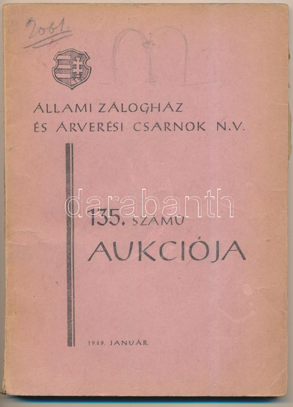 1949 Állami zálogház és árverési csarnok NV. árverási katalógusa 98p. https://www.darabanth.com/de/250-Fernauktion/250.0/Andere-Sammelgebiete/Drucksachen~1400004/1949-Allami-zaloghaz-es-arveresi-csarnok-NV-arverasi-katalogusa-98p~II1208498