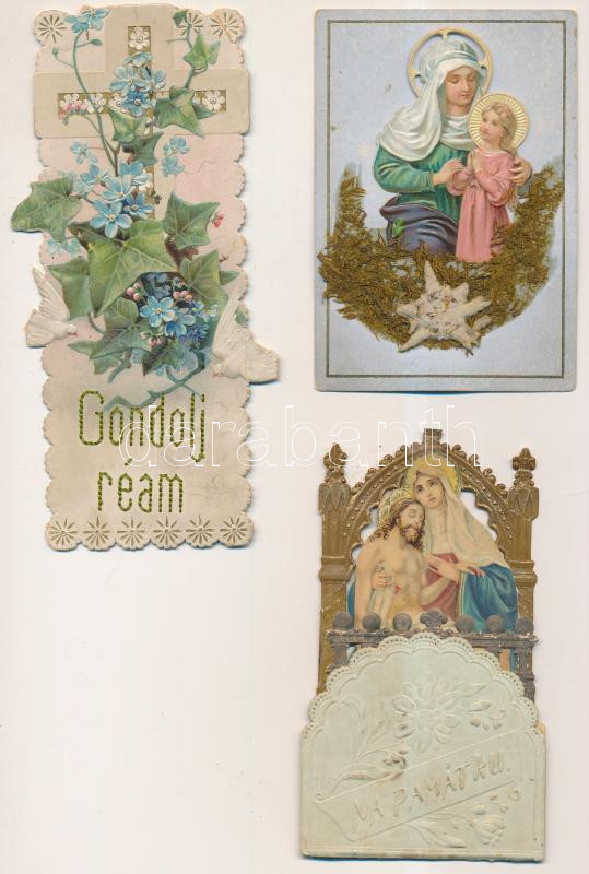 Beschreibung: cca 1900 Különleges szentképek (dombornyomott, betétes, kihajtható térbeli), 3db,apró hibákkal, cca 11x6cm