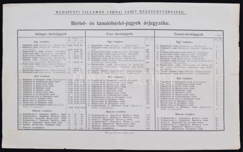 Beschreibung: cca 1910-20 Bérlet- és tanulóbérlet-jegyek árjegyzéke, Budapesti Villamos Városi Vasut Részvénytársaság, nyomtatvány, szakadással, 21x34cm
