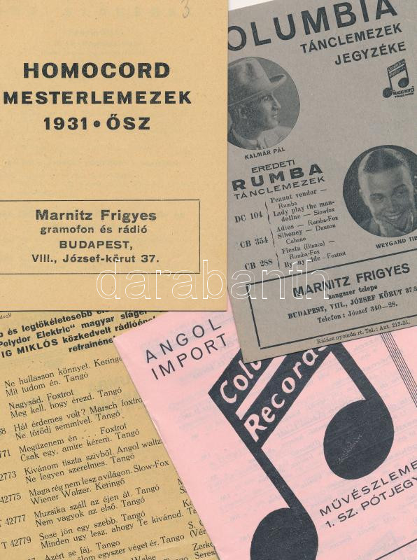 cca 1931 4 db különböző hanglemez árjegyzék (Homocord, Columbia, Polyd... https://www.darabanth.com/de/250-Fernauktion/250.0/Andere-Sammelgebiete/Drucksachen~1400004/cca-1931-4-db-kulonbozo-hanglemez-arjegyzek-Homocord-Columbia-Polydor~II1203973