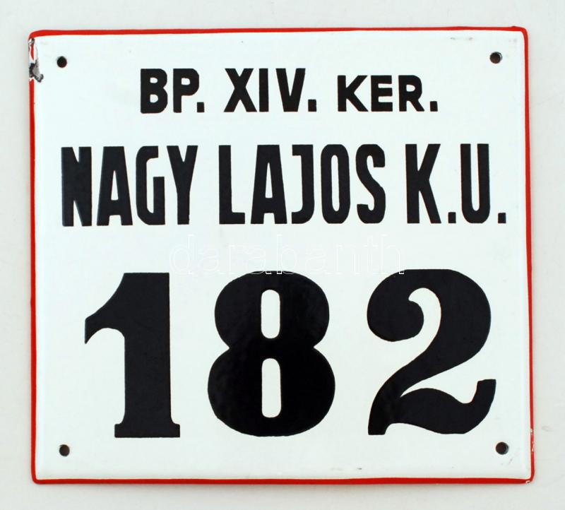 "Bp. XIV. ker. Nagy Lajos K.u. 182" feliratú fém háztábla, 22x20 cm https://www.darabanth.com/de/250-Fernauktion/250.0/Andere-Sammelgebiete/Flohmarkt~1400024/Bp-XIV-ker-Nagy-Lajos-Ku-182-feliratu-fem-haztabla-22x20-cm~II1208393