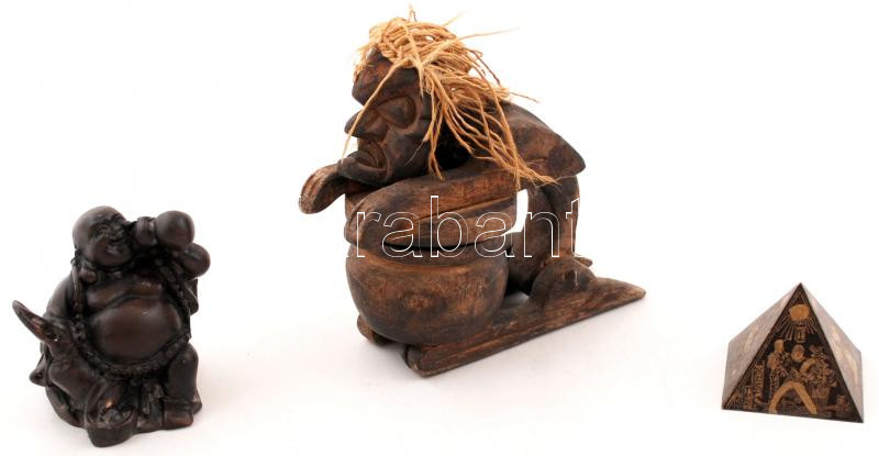 Fából készült, faragott afrikai motívumos mécsestartó 12 cm + ülő Buddha szobor, műgyanta, jelzés nélkül, m: 7,5 cm + egyiptomi motívumokkal díszített bakelit(?) piramis, 4,5 cm