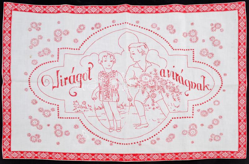 Falvédő, " Virágot a virágnak" felirattal, vászon, 56×82 cm https://www.darabanth.com/de/250-Fernauktion/250.0/Andere-Sammelgebiete/Flohmarkt~1400024/Falvedo--Viragot-a-viragnak-felirattal-vaszon-56C39782-cm~II1202698
