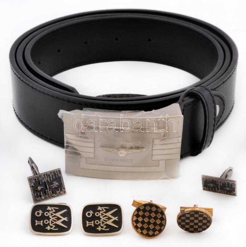 Beschreibung: Fekete bőr öv bontatlan csomagolású bőr csattal, h: 130 cm, 3 pár mandzsettagombbal