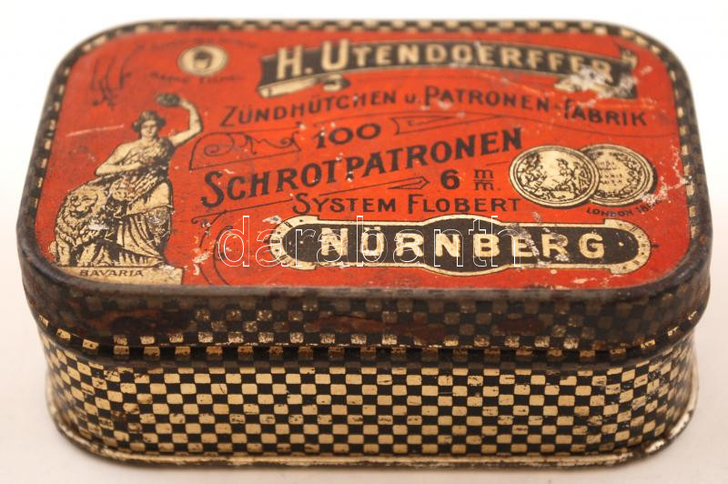 H. Utendoerffer Schrotpatronen, Nürnberg, fémdoboz, 5x7x2,5cm https://www.darabanth.com/de/250-Fernauktion/250.0/Andere-Sammelgebiete/Flohmarkt~1400024/H-Utendoerffer-Schrotpatronen-Nurnberg-femdoboz-5x7x2-5cm~II1201119