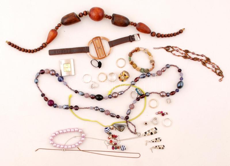 Beschreibung: Kis doboznyi divatos ékszer és óra(2 db): gyűrűk, karkötők, láncok, függők, közte egy fülbevaló-nyaklánc szettel