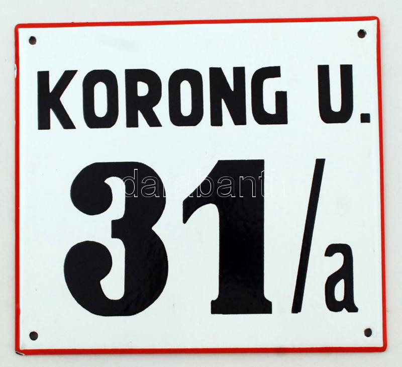 "Korong u. 31/a" feliratú fém háztábla, 22x20 cm https://www.darabanth.com/de/250-Fernauktion/250.0/Andere-Sammelgebiete/Flohmarkt~1400024/Korong-u-31a-feliratu-fem-haztabla-22x20-cm~II1208387