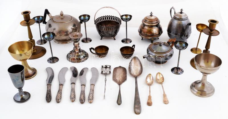 Beschreibung: Nagy fém tételek: réz gyertyatartók, alpakka kiöntők, kelyhek, evőeszközök stb, több jelzett (Christofle, K&C2), egy hibás, összesen: 27 db