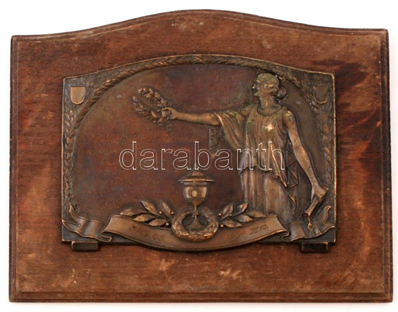 Beschreibung: Régi díszes emlékplakett 1924-34, Siklós, Fellner László tánctanárnak 10 éves munkájáért,réz fa szupporton, 17x20cm