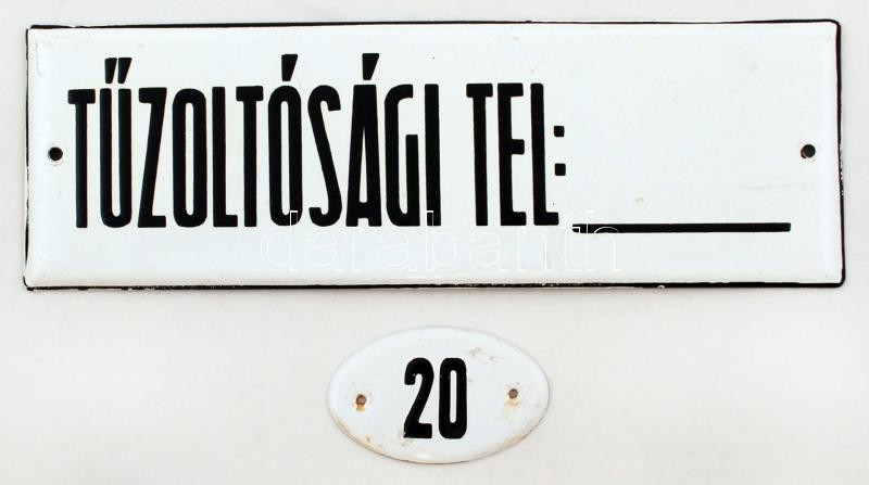 "Tűzoltósági tel:" és "20" feliratú fém tábla, 30x10 és 8x5 cm https://www.darabanth.com/de/250-Fernauktion/250.0/Andere-Sammelgebiete/Flohmarkt~1400024/Tuzoltosagi-tel-es-20-feliratu-fem-tabla-30x10-es-8x5-cm~II1208385