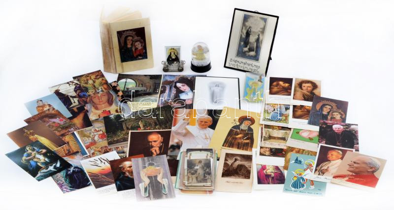 Beschreibung: Vegyes kegytárgyak: üvegezett szentkép, szenteltvíz, hógömb angyalkával, szentképek, imakönyv