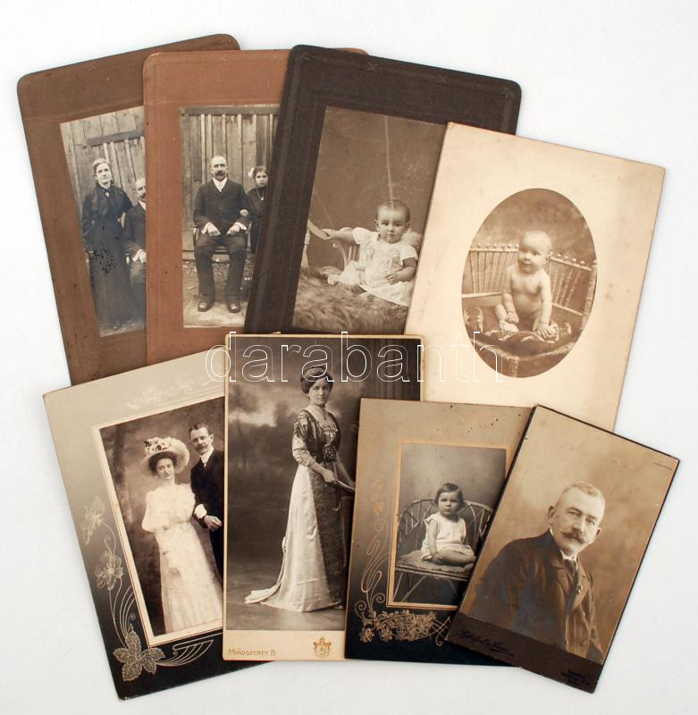 Beschreibung: cca 1900-1930 Családi portrék, csoportképek, 8 db különféle keményhátú fotó, különféle külföldi és magyar műtermekből, különböző méretben